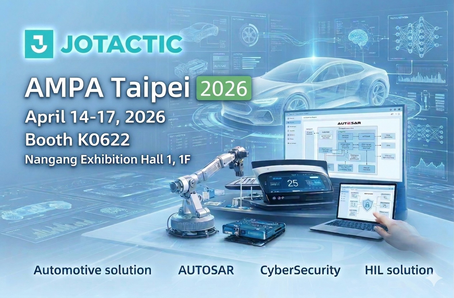 捷策動能 誠摯邀請您參與 2026 台北國際汽機車零配件展。本次展會,我們將匯集全球頂尖技術合作夥伴,展示涵蓋車用軟體架構、數位座艙、模擬動態測試及馬達設計等全方位解決方案,助力您在轉型浪潮中搶佔先機。
